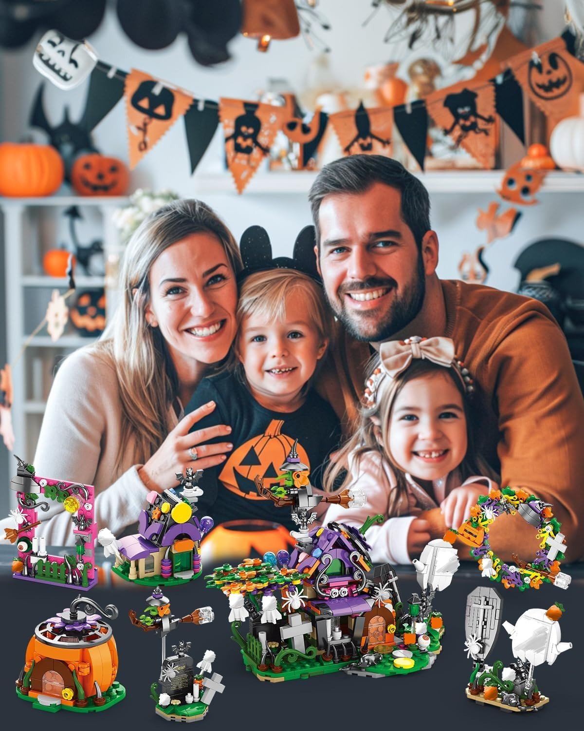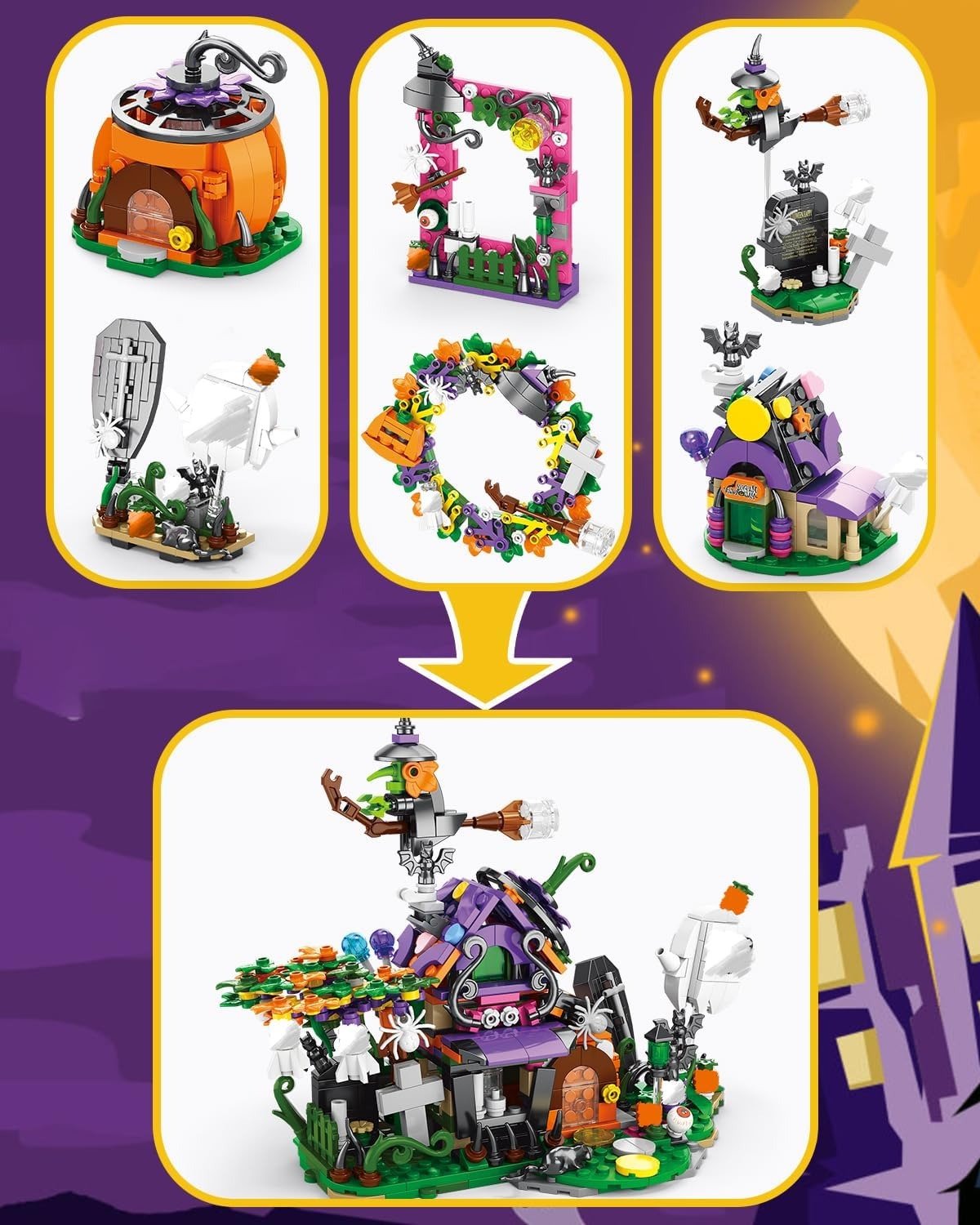 Build your own haunted scene with 6 different sets – little ghost, witch, candy house, picture frame, Halloween wreath, and pumpkin cabin. Combine them to create a full haunted house! 🏚️✨
