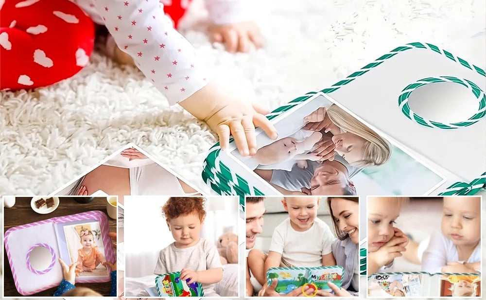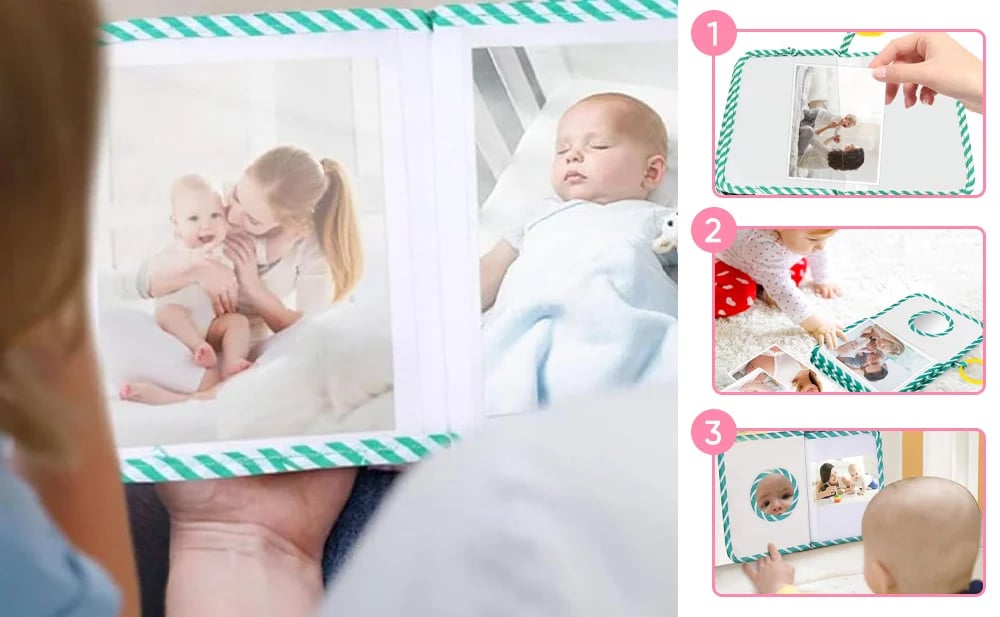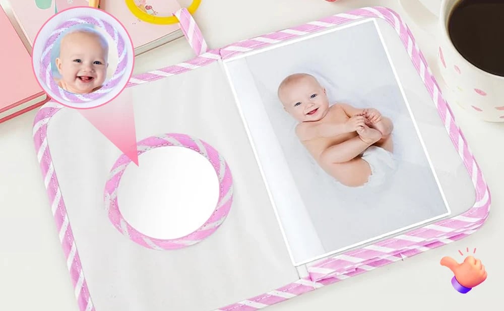 The My First Baby Photo Book with Safe Mirror is the product that allows your baby to physically touch and bond with their own family photos while simultaneously developing crucial self-awareness through the safe mirror.